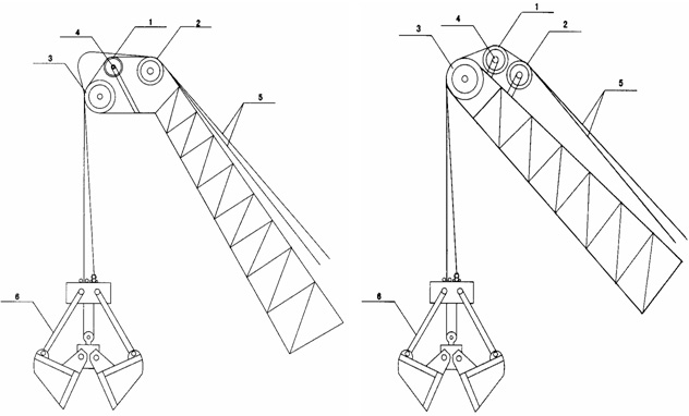 1、稱重滑輪2、過(guò)橋滑輪3、吊臂滑輪4、測(cè)力傳感器5、提升、開閉繩6、無(wú)功抓斗